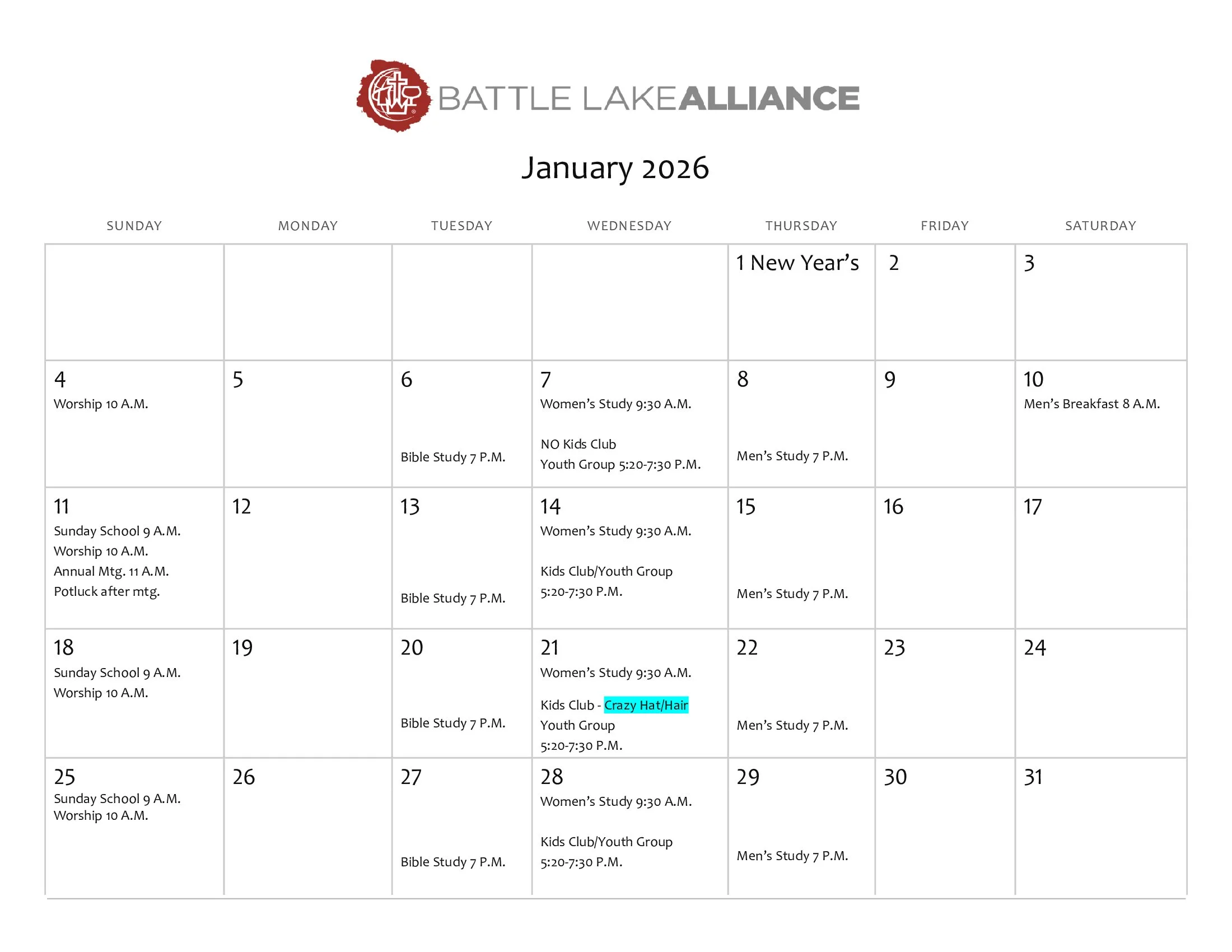 Activities and Events of Battle Lake Alliance Scheduled for January 2026